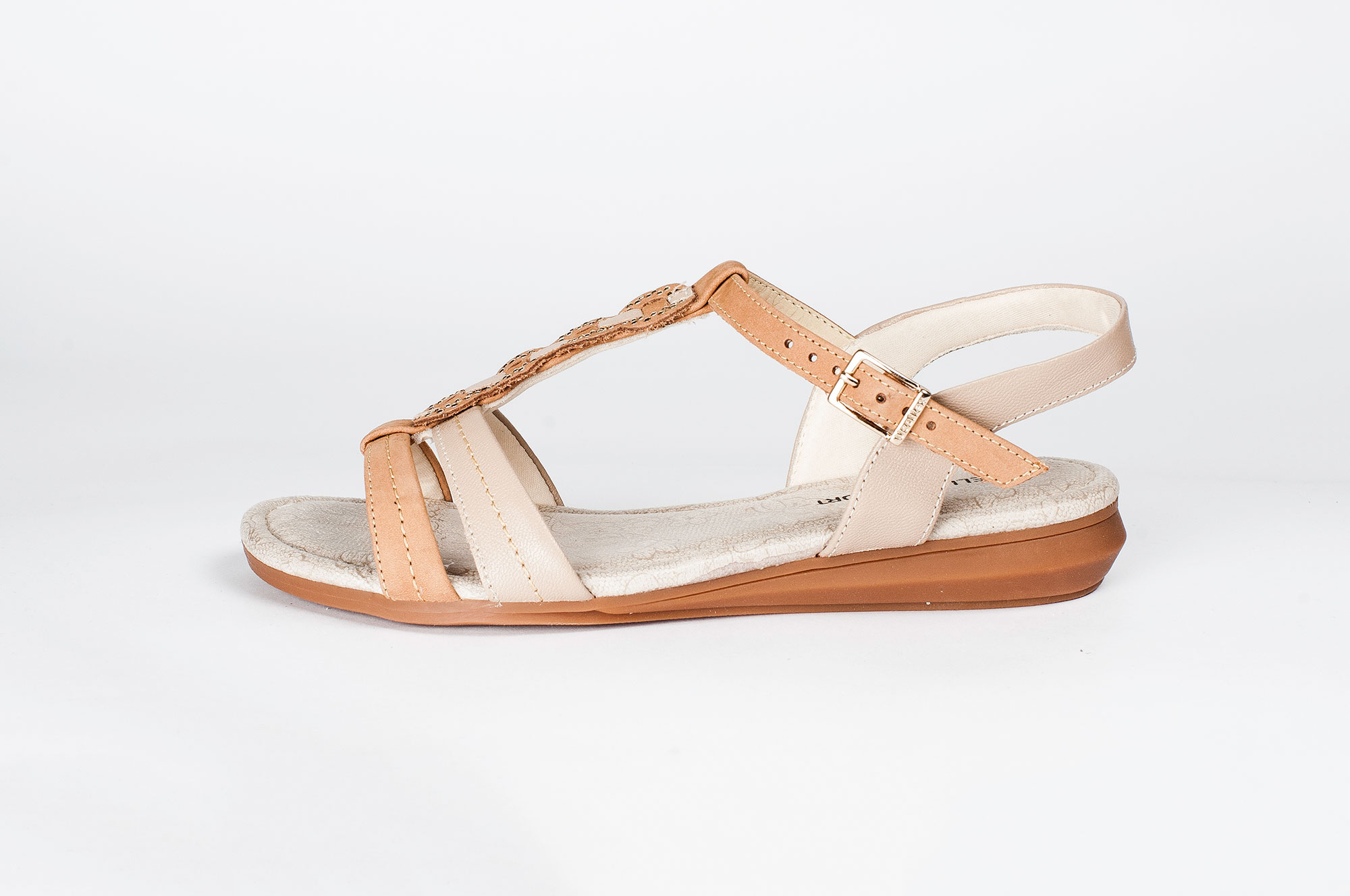 Sandália camel com aplicações em dourado. Salto com em cunha com 2 cm.